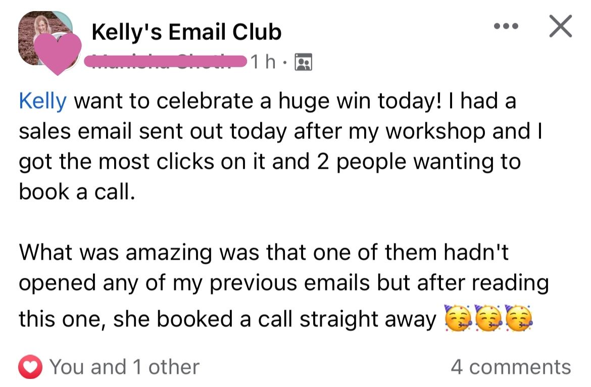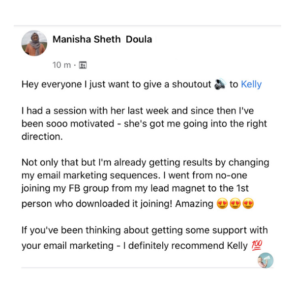 Kelly helped me enormously in improving my email marketing. Having her virtually by my side was exactly what I needed as I learned how to write better emails to engage with my audience.